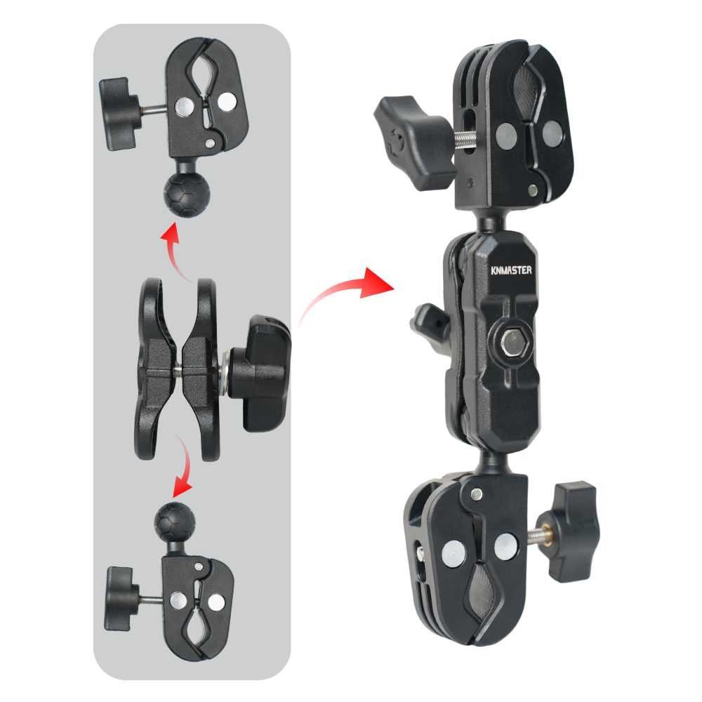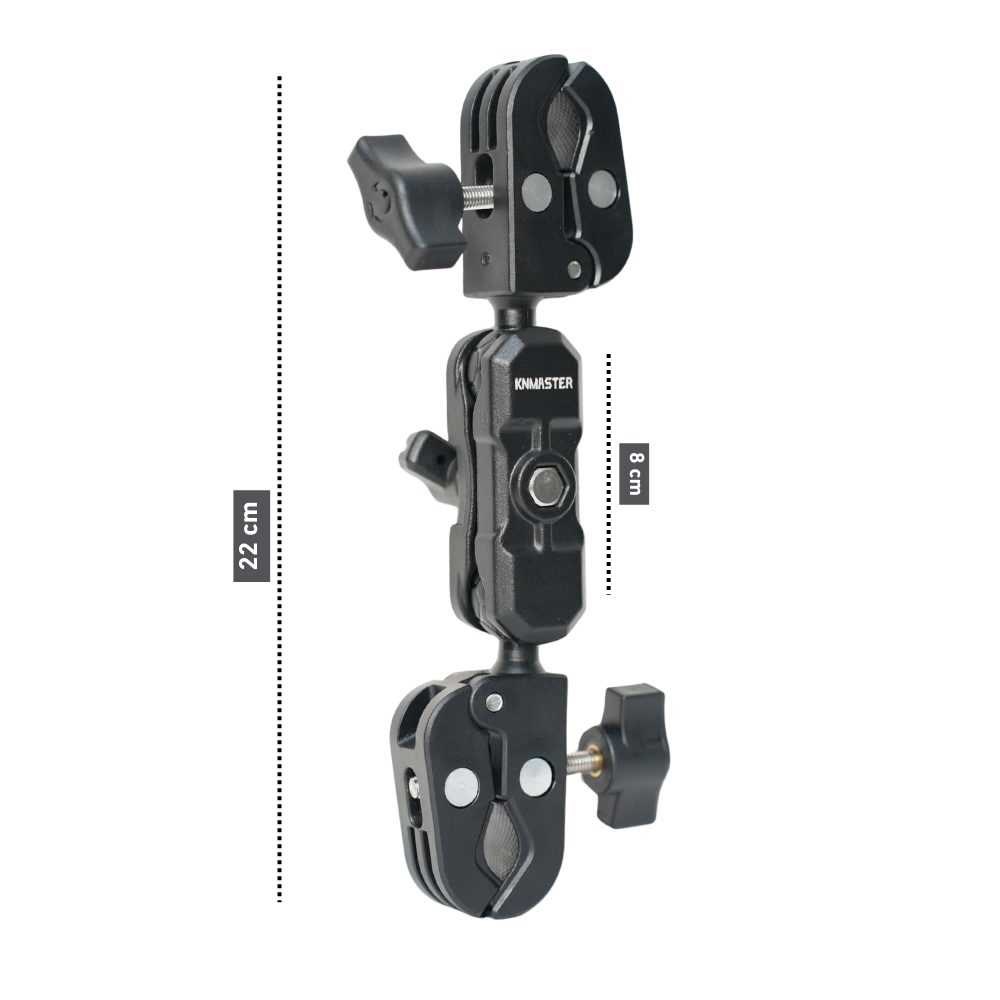 Knmaster MC160 ? 360° Ayarlanabilir Motosiklet Çift Yengeç Kelepçeli (Double Clamp) Aksiyon Kamera Destek Aparatı (22 cm) Knmaster MC160, profesyonel vlog çekimleri, motosiklet sürüşleri, fotoğrafçılık ekipman kurulumu ve çok yönlü kamera sabitleme ihtiyaçları için tasarlanmış çift kelepçeli ? çift top kafalı bir destek aparatıdır. Toplam 22 cm uzunluğa sahip olan MC160?ın 8 cm ara bağlantı aparatı, daha geniş hareket alanı sunar ve kameranın istenen açıya kolayca ayarlanmasını sağlar. Her iki ucundaki güçlü yengeç tipi kelepçe; gidon demiri, koruma demiri, çanta demiri, boru yüzeyleri, tripod kolları, ışık stantları, masa kenarı ve raf gibi birçok alana güvenli bir şekilde tutunur. Bu yapısı sayesinde hem motosiklet kullanıcıları hem de fotoğraf/video üreticileri için çok amaçlı bir çözümdür. Güçlendirilmiş gövde yapısı ve alüminyum alaşımlı bağlantıları sayesinde sağlam, hafif ve uzun ömürlü bir kullanım sunar. Aksiyon kameraları, ışık aksesuarları, mini monitörler ve tripod uyumlu cihazlarla uyumludur.