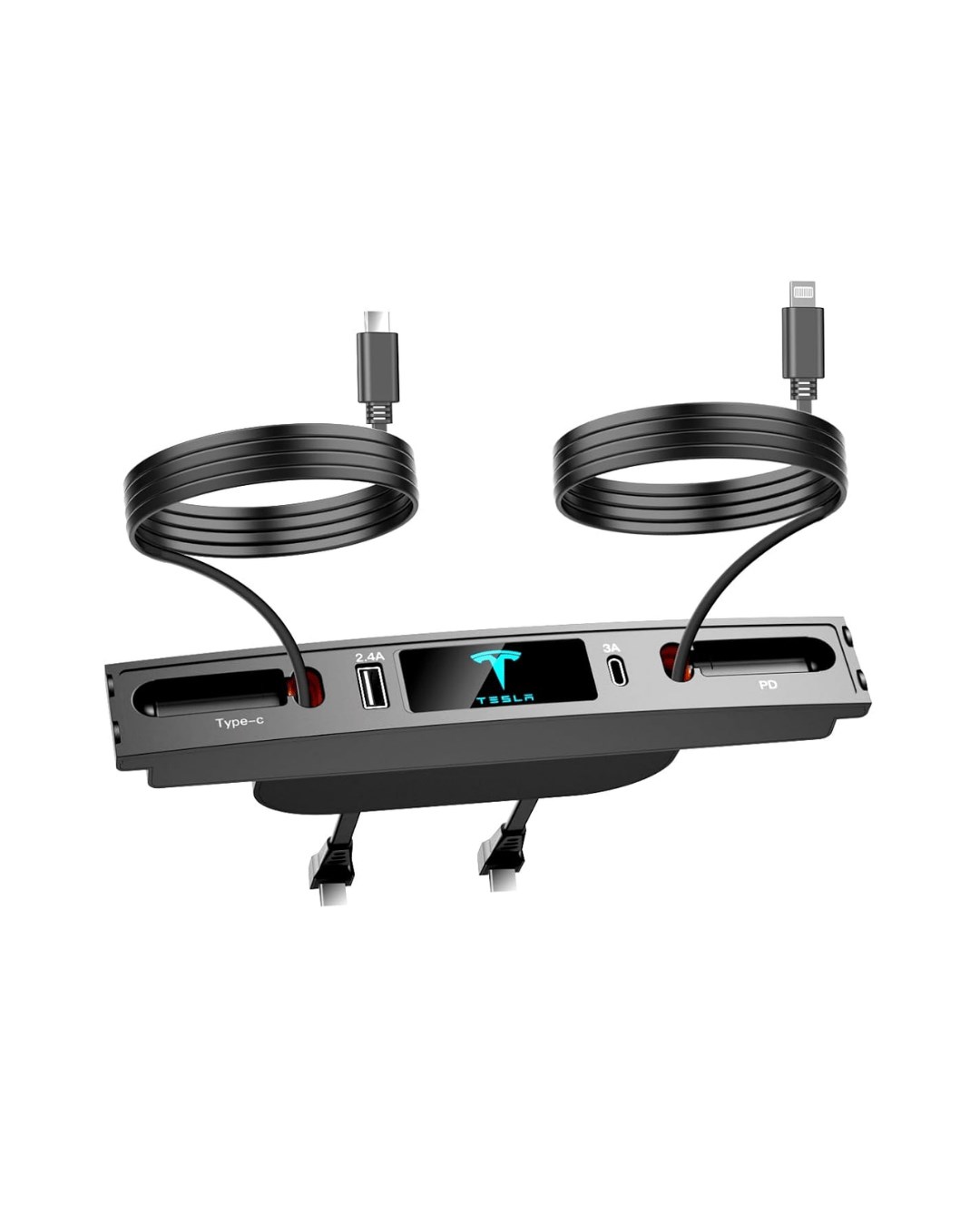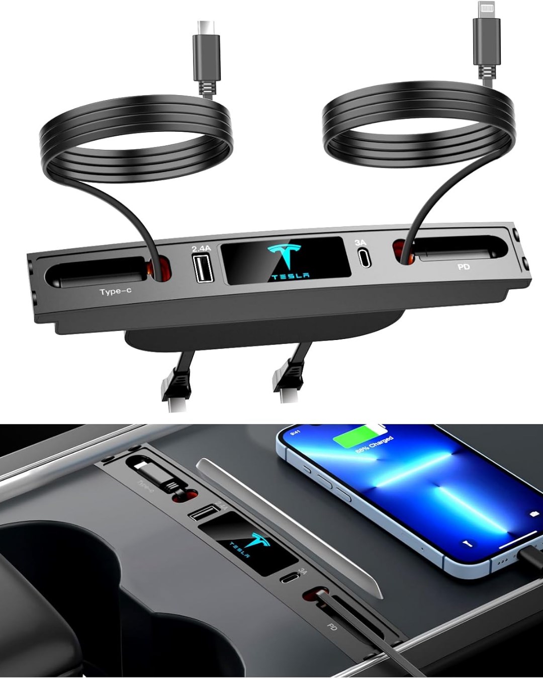 Type-C ve iPhone PD uyumlu yapısı sayesinde farklı cihazlarla kullanım imkânı sunar. Teleskopik tasarım, orta konsol alanında daha düzenli bir kullanım hedefler. Siyah renk seçeneği, araç iç tasarımıyla uyumlu sade bir görünüm sağlar.